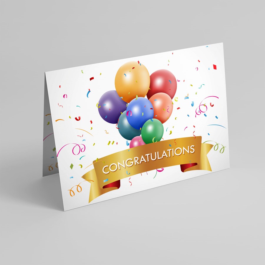 For a refined, professional celebration, this congratulations card pairs vibrant, multi-colored balloons and scattered confetti with a striking gold ribbon banner that reads CONGRATULATIONS. The clean white background and playful streamers keep the design festive yet polished, making it easy to present at formal events or more personal moments. Printed text and a horizontal layout ensure the message is clear and instantly legible.