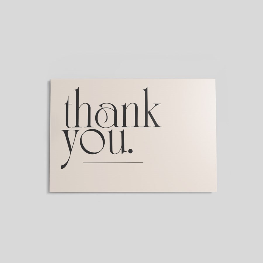 Convey professional gratitude with a clean, modern design that reads instantly. The front features the words thank you. in bold black typography set on a soft beige field, anchored by a thin black horizontal line for a restrained, stylish look. A white-front option is available for easy personalization and the reverse is plain white for handwriting or addressing—so each card is ready to use without sacrificing a refined, business-appropriate appearance.