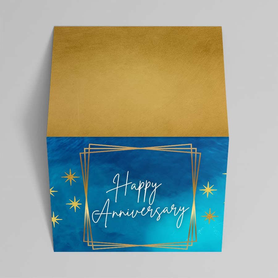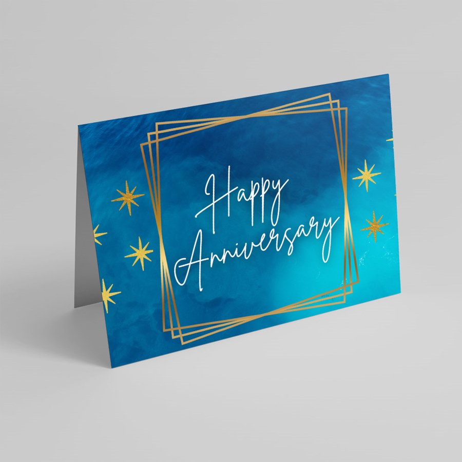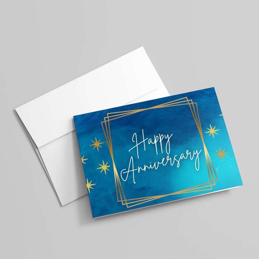 Celebrate milestones with refined, professional style. The front features Happy Anniversary in flowing white cursive set against a blue watercolor-to-gradient background, framed by a thin gold geometric outline and scattered gold star motifs. The composed layout keeps the focus on your message, delivering an elegant, understated look that suits both personal sentiment and polished corporate correspondence. Inside, a clean white interior is ready for your custom verse, signatures and/or logo—ideal for personalization and keepsake presentation. Designed for small businesses, teams and executive outreach, this versatile card is perfect for client anniversaries, employee service awards, partner milestones, executive greetings and VIP gift enclosures. From an established leader in premium business greetings and custom print solutions for over 50 years, the Golden Frame Anniversary design pairs professional aesthetics with fast, affordable personalization to help you celebrate and strengthen key relationships.