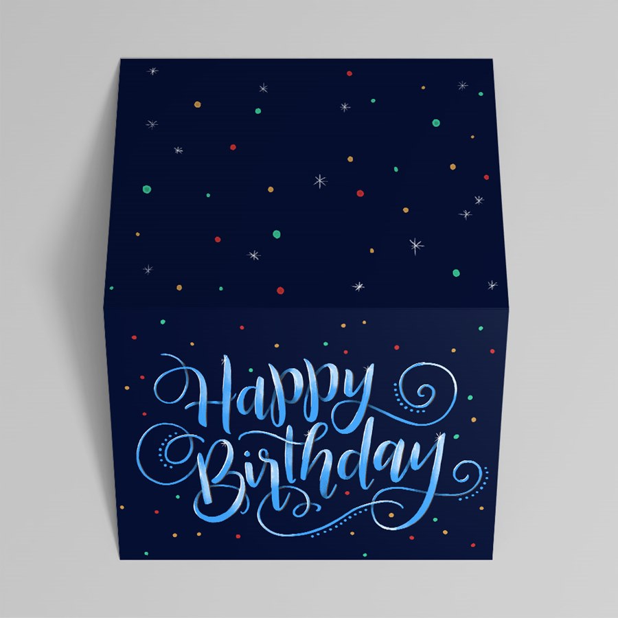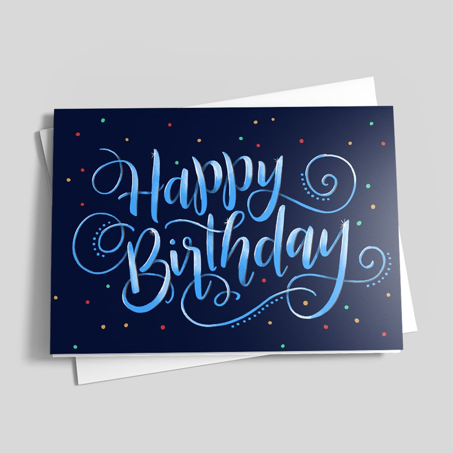 Birthday Card — Navy Script & Confetti