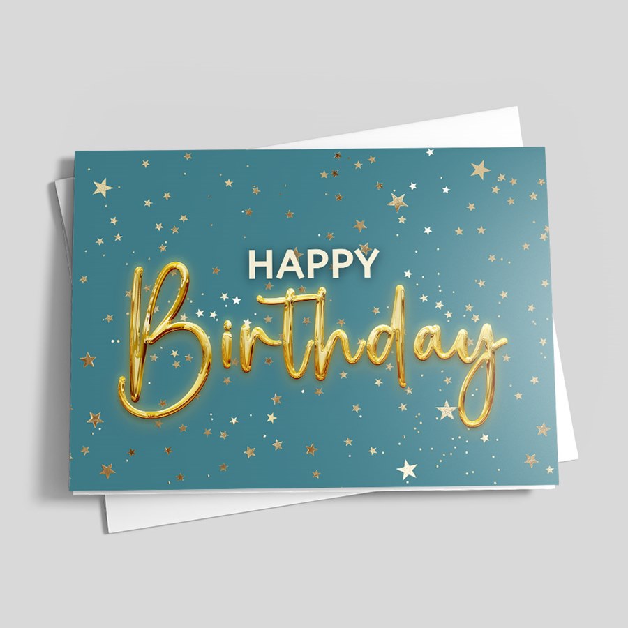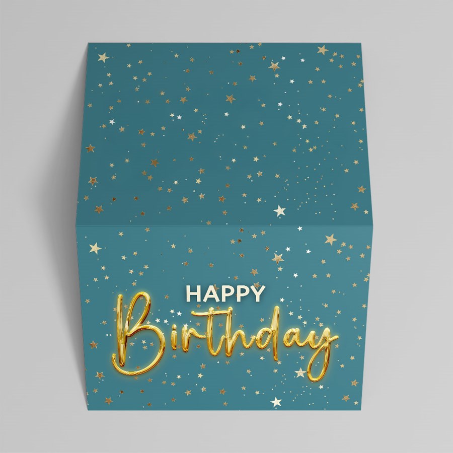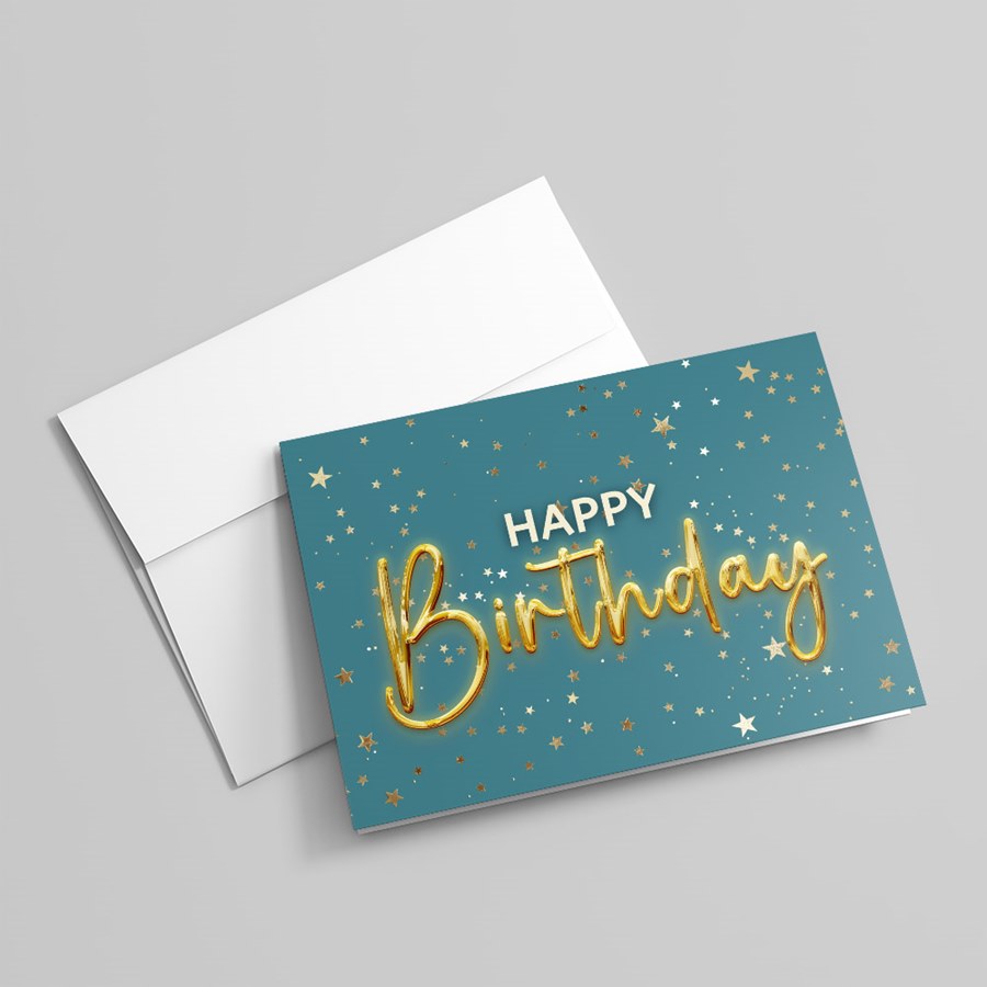 The Star Studded Birthday Card pairs a rich teal field with scattered gold and white stars and a striking typographic center: HAPPY in bold white beside Birthday in a metallic-effect gold script. This high-contrast composition and polished gold lettering deliver a memorable, upscale look suited to clients, colleagues and executives, while the clean white interior is left blank to accept a printed verse, signatures or your company logo. Designed for businesses that need affordable, fast, and versatile branded greetings, this card is perfect for client milestones, staff birthdays and executive acknowledgments. Personalize each piece with names, messages or your logo to maintain consistent corporate communication — from an established leader in premium business greetings for over 50 years and available with quick turnaround and customization options to fit campaigns and bulk orders.Common Customer Questions