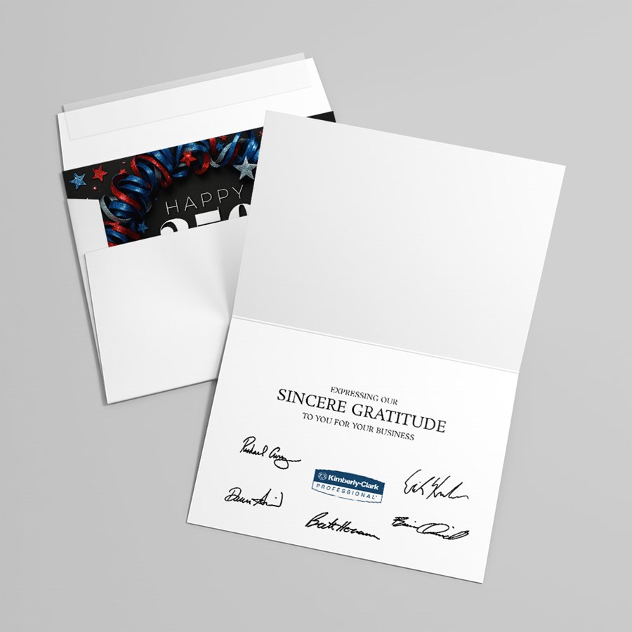 Professional occasions — designed for patriotic events, corporate commemorations, community celebrations, and branded mailings where a polished, thematic card matters.