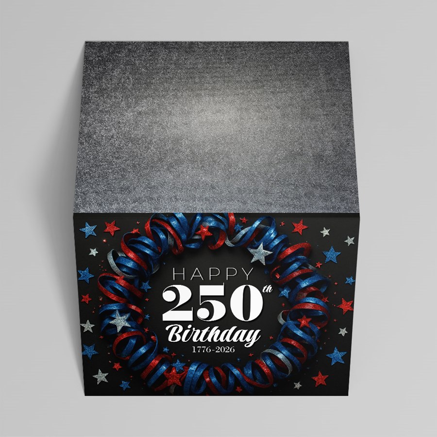 Striking commemorative cover — bold black background with a circular arrangement of red, blue, and silver ribbons and stars and the prominent message HAPPY 250th Birthday (years 1776–2026) for an unmistakable patriotic statement.